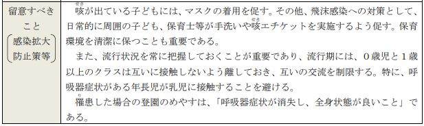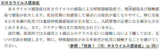 特に呼吸器症状がある年長児が乳児(0歳児)に接触することを避ける,と記載してあります.