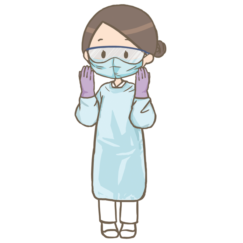 少し古いですが,国立感染症研究所などで作成した医療関係者など向けの文書では,患者の検体採取などの際には「サージカルマスク,目の防護具(ゴーグル,フェイスシールド等),長袖ガウン,手袋を装着する」となっています.